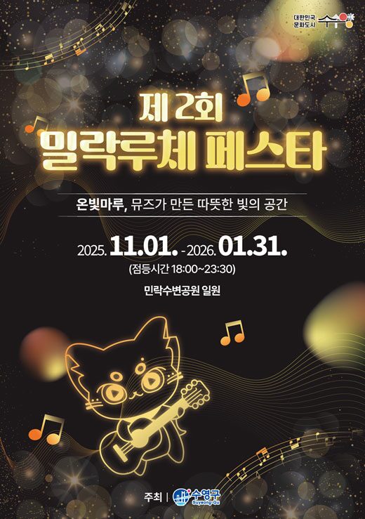 2nd Millak Luce Festaは、「Onbit Maru(オンビッマル)」をテーマに開催される冬のライトフェスティバル。温かく多彩な光が集う空間をコンセプトに、民락水辺公園の海沿いエリアが光とメディアアートで彩られる。光の演出、メディアアート作品、体験型コンテンツなどが展開され、夜の海と調和した幻想的な景観が広がるイベントとして実施される。