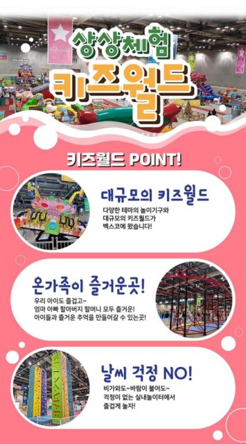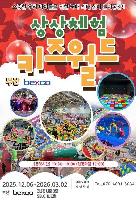 2026 상상체험 키즈월드 이벤트は、BEXCO第2展示場で開催される大規模な室内型キッズ体験イベント。多彩なテーマの遊具や体を動かして楽しめるアトラクションが揃い、天候に左右されずに遊べる屋内空間として展開される。子どもはもちろん、家族全員で過ごせる体験型の遊び場として企画されている。